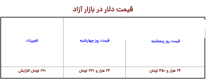 | ۲۳ هزار و ۶۲۷ تومان | ۲۳ هزار و ۶۱۳ تومان | ۱۴ تومان افزایش |