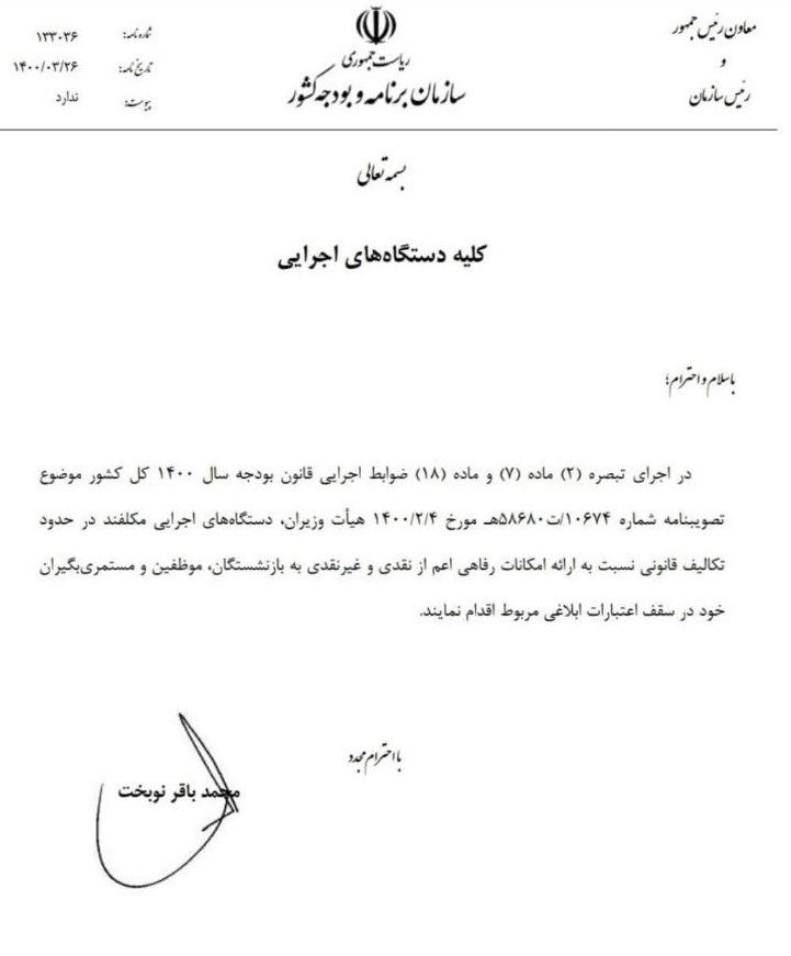 محمد باقر نوبخت در بخشنامه ای به کلیه دستگاههای اجرایی اعلام کرد، در اجرای تبصره 2 ماده هفت و ماده 18 ضوابط اجرایی قانون بودجه سال 1400 کل کشور موضوع تصویب نامه 4/2/1400 هئیت وزیران، دستگاههای اجرایی موظفند در حدود تکالیف قانونی به ارائه امکانات اعم از نقدی و غیر نقدی به بازنشستگان، موظفین و مستمری بگیران خود در سقف اعتبارات ابلاغی مربوطه اقدام کنند.
