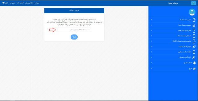 در صفحه بازشده، شناسه (IMEI) دستگاه خود را که میخواهید اطلاعات آن از کارتابل قبلی (کارتابل حذفشده) به این کارتابل انتقال یابد را وارد کنید و روی گزینه «ثبت» کلیک کنید. سپس پیامی مبنیبر وارد کردن شماره سیمکارت قبلی (سیمکارت منقضی یا واگذارشده) را دریافت میکنید. شماره سیمکارت را بهصورت کامل وارد کرده و روی گزینه «تأیید» کلیک کنید. در صورتی که اطلاعات واردشده صحیح باشد فرایند با موفقیت انجام شده و اطلاعات دستگاه شما در این کارتابل قرار میگیرد.