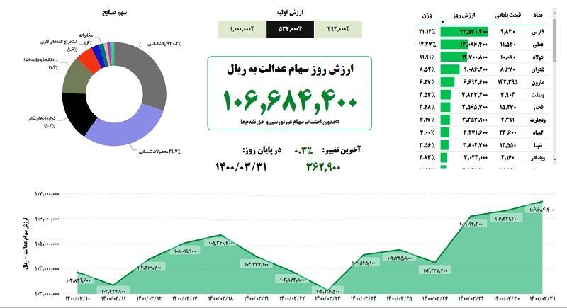 ارزش سبد سهام عدالت امروز افزایش پیدا کرد؛ ارزش سبد سهام عدالت ۵۳۲ هزار تومانی به ۱۰ میلیون و ۶۶۸هزار تومان و ارزش سبد سهام عدالت یک میلیونی به ۲۰ میلیون و ۹۵ هزار تومان رسید