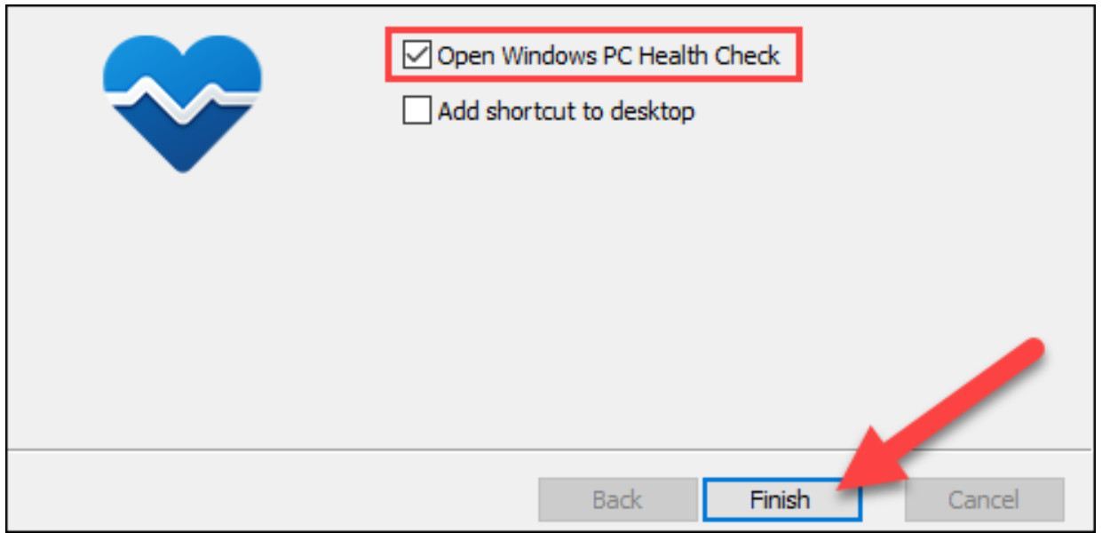 سپس کادر "Open Windows PC Health Check" را علامت بزنید و "Finish" را انتخاب کنید.