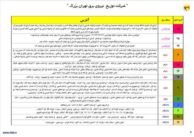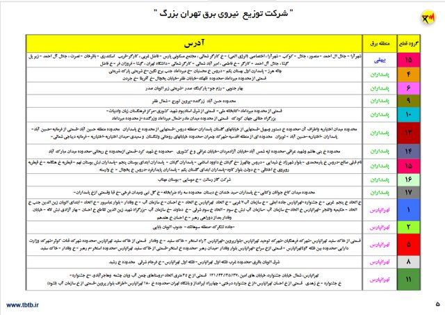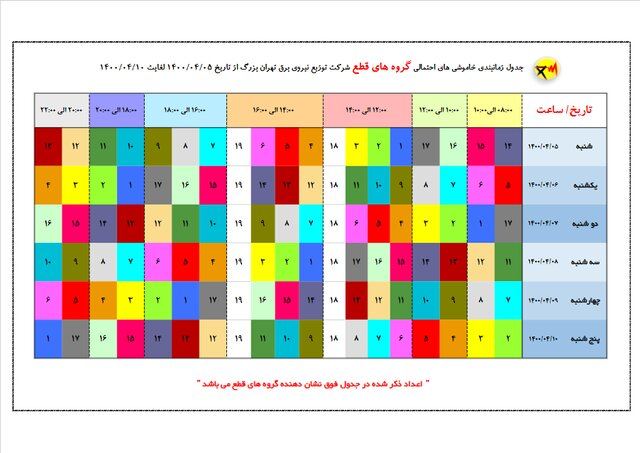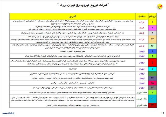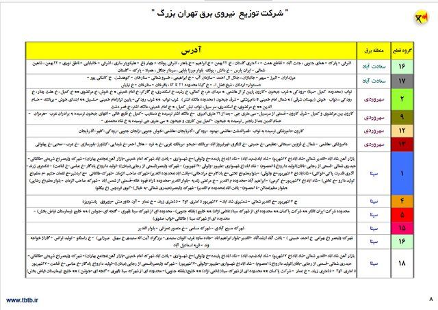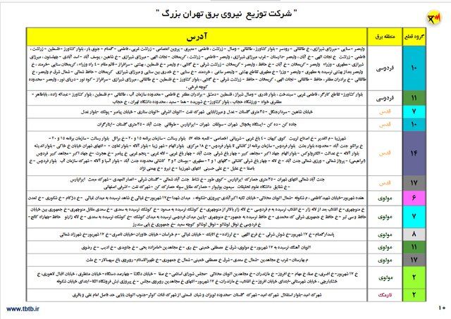 برای مشاهده جدول خاموشی‌های احتمالی قطع برق شهر تهران از تاریخ ۵ تا ۱۰ تیر۱۴۰۰ کلیک کنید.