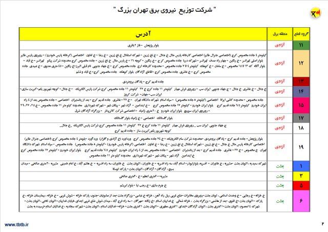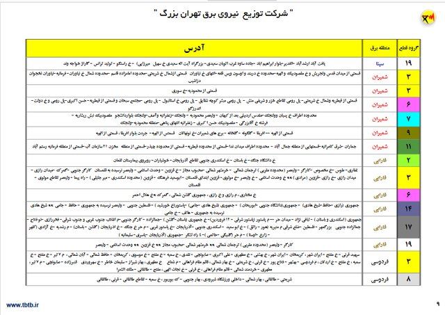 به گزارش سایت طلا، جداول خاموشی تهران تا پنج روز آینده منتشر شد و طبق اعلام شرکت توزیع نیروی برق تهران بزرگ، تمامی ظرفیت‌های فنی و کارشناسی شرکت توزیع نیروی برق تهران بزرگ به منظور جلوگیری از بروز هرگونه خاموشی به‌کار گرفته شده است. با این حال از آن جا که موفقیت در این مهم، جز با همکاری همه جانبه مشترکان، امکانپذیر نیست در صورت بروز هرگونه مشکل در تامین برق پایتخت به منظور جلوگیری از بروز قطعی گسترده، طبق فایل پیوست اقدام به اعمال خاموشی کنترل شده خواهد شد.