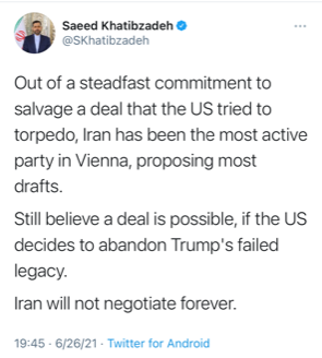به گزارش سایت طلا،سعید خطیب‌زاده سخنگوی وزارت امور خارجه جمهوری اسلامی ایران امروز (شنبه) در توئیتی نوشت: ما به واسطه تعهد جدی خود به حفظ توافقی که ایالات متحده تلاش کرده بود آن را نابود کند، فعال‌ترین طرف در وین بوده‌ایم و اغلب پیش‌نویس‌ها را ما پیشنهاد داده‌ایم.
