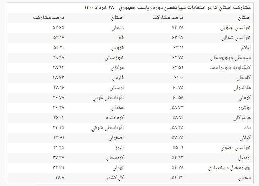 بر اساس اعلام رئیس ستاد انتخابات کشور، جدول میزان مشارکت در انتخابات ۲۸ خرداد ۱۴۰۰ به تفکیک ۳۱ استان کشور در تصویر زیر آمده است.