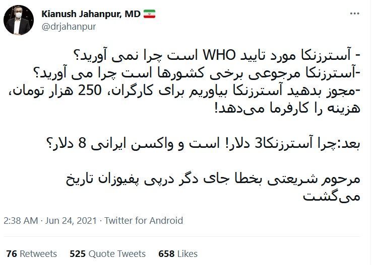 کیانوش جهانپور هفته گذشته توئیتی عجیب منتشر کرد که در اینگونه برداشت می شد که به منتقدان روند واکسیناسیون در کشور فحاشی کرده و آنها را «پفیوز» خوانده است.
