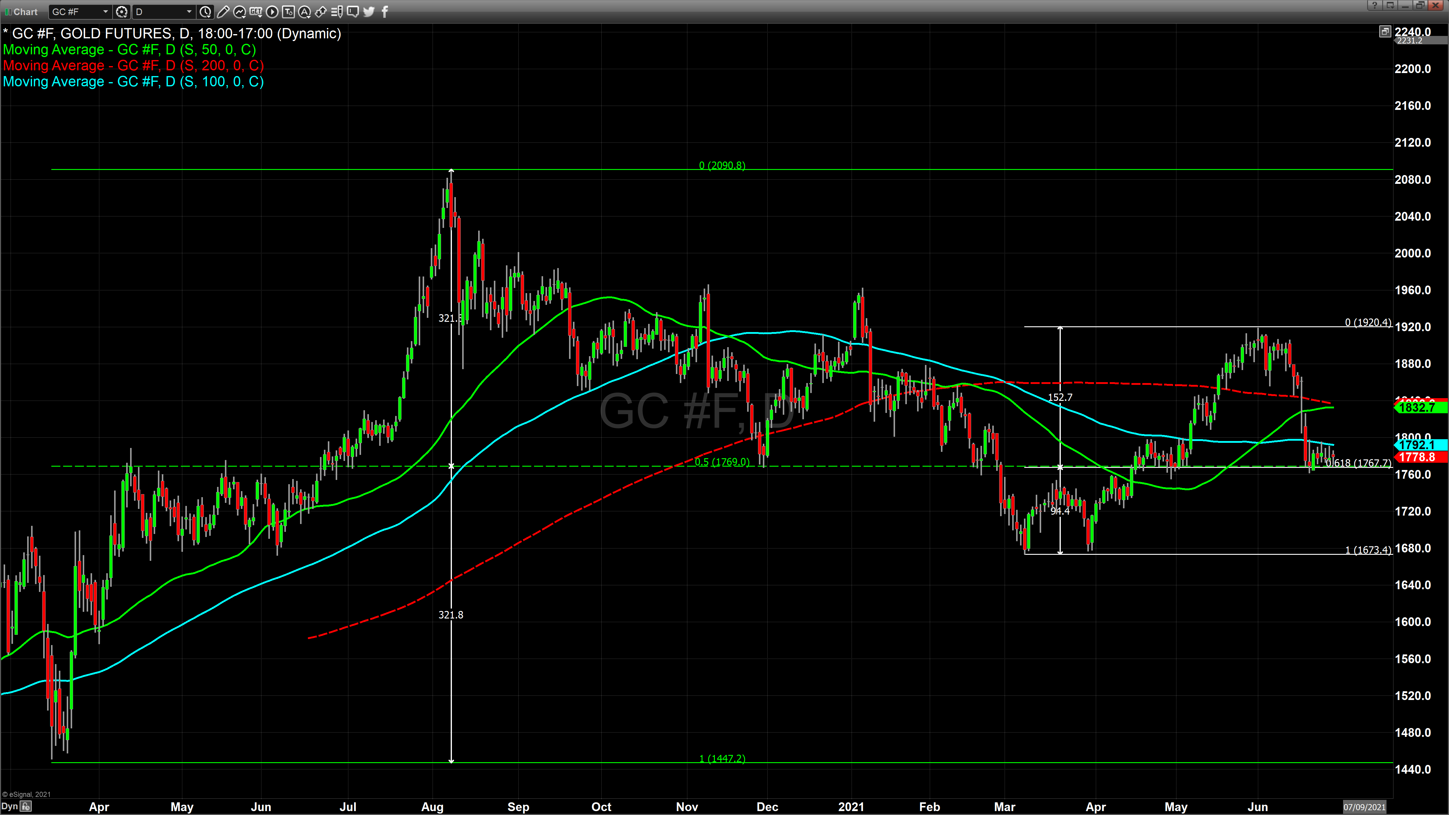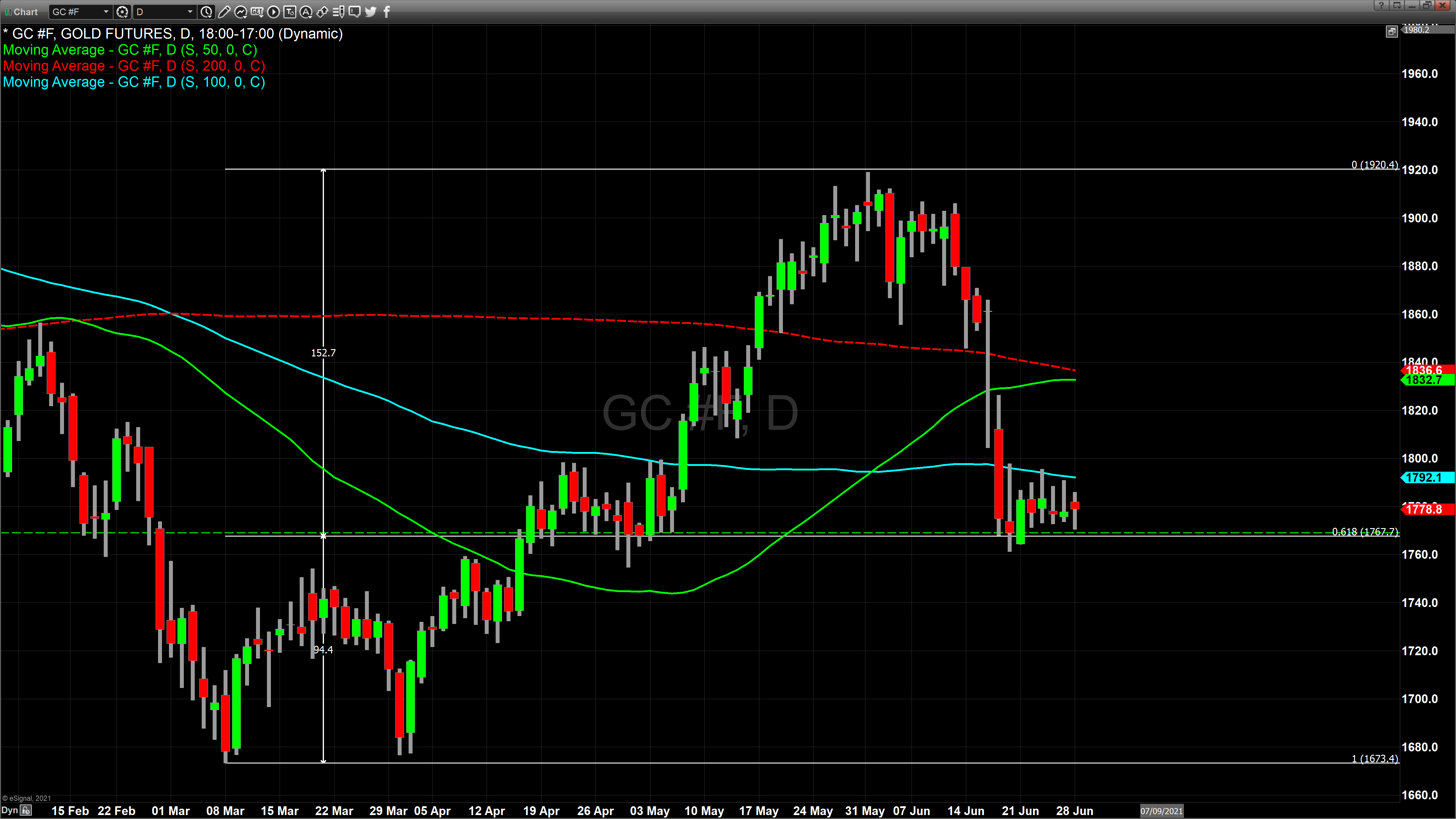 بار دوم طلا از 1667 دلار قیمت خود را آغاز کرده و به 1920 دلار رسیده است. اگر به این دو صعود قیمت طلا نگاه کنیم که الگوی فیبوناچی مشاهده می کنیم که نشان دهنده کف جدید قیمتی طلا در 1767 دلار است.