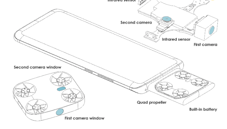 در نگاه اول به این اسناد به نظر میرسد ما با یک گوشی هوشمند معمولی سروکار داریم. اما در پایین این گوشی، یک محفظه اضافی تعبیه شده است که شامل یک سیستم دوربین مخفی با دوربین دوتایی، سه سنسور مجاورت مادون قرمز، چهار پروانه و یک باتری اضافی است. سیستم دوربین میتواند به بیرون از محفظه کشیده شود و همراه با براکت نصب شده، کاملاً قابل جابجایی باشد. براکت نصب، با سنسور اثر انگشت یکپارچه، میتواند از سیستم دوربین جدا شود. سیستم دوربین نیز میتواند به لطف پروانههای یکپارچه به هوا پرواز کند تا از فاصله بیشتری عکس بگیرد. این پهباد کوچک همچنین با استفاده از سنسورهای مادون قرمز میتواند فاصله خود با اشیا دیگر را محاسبه کند تا از برخورد هنگام پرواز جلوگیری شود.