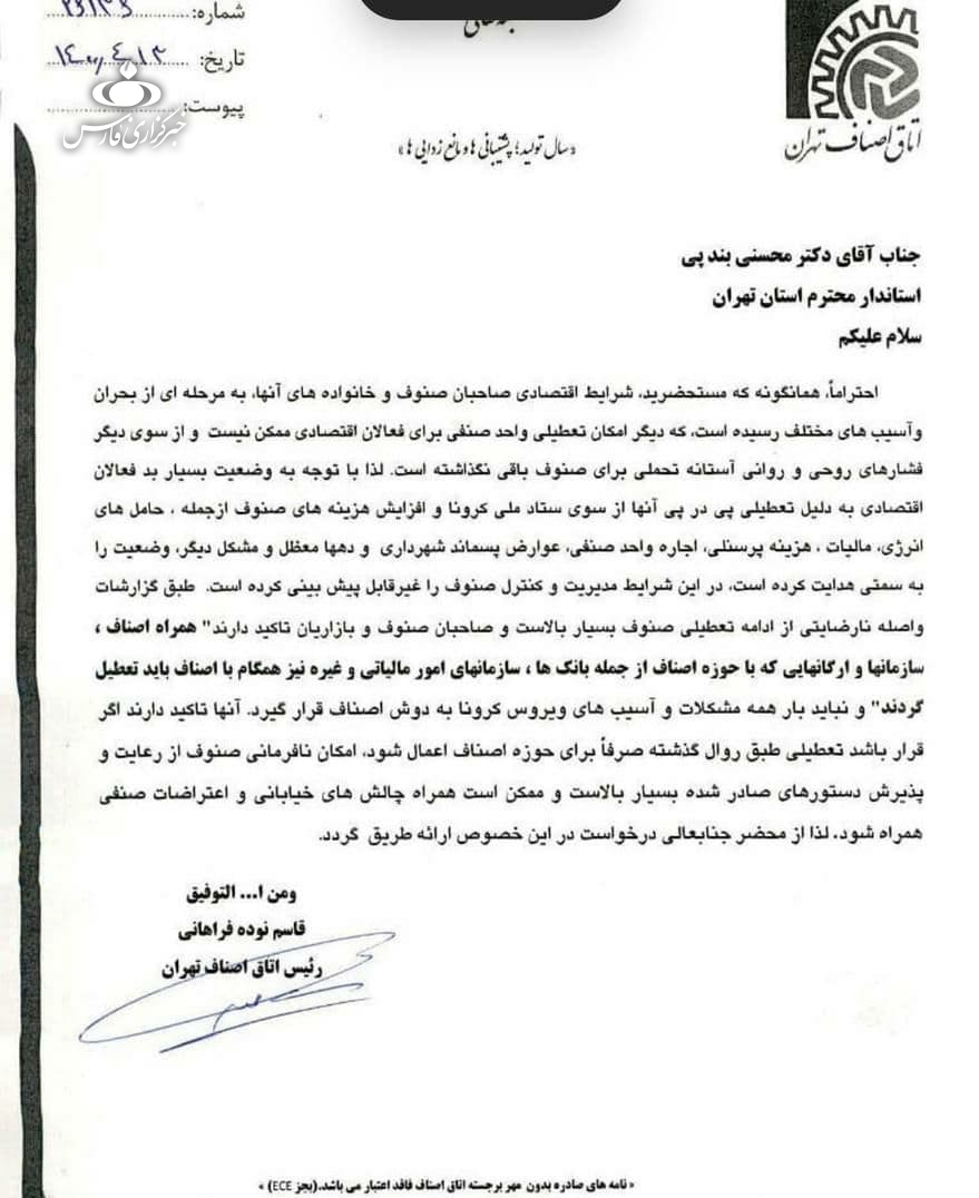 در نامه قاسم نوده فراهانی رئیس اتاق اصناف به محسن بندپی استاندار استان تهران در مورخ 1400/4/13 آمده است: