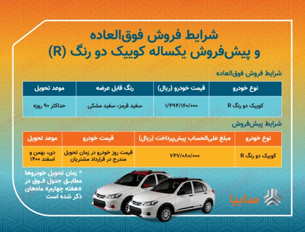 گروه خودروسازی سایپا شرایط فروش فوق العاده و پیش فروش یکساله خودروی کوئیک دو رنگ را اعلام کرد.