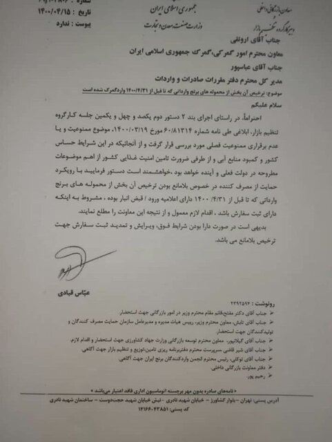 در این نامه همچنین خاطرنشان شده که در صورت دارا بودن شرایط یاد شده ویرایش و تمدید ثبت سفارش جهت ترخیص بلامانع است.