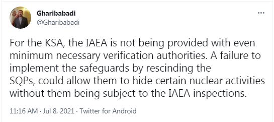 نماینده دائم ایران در آژانس بینالمللی انرژی اتمی در واکنش به ادعاهای واهی نماینده عربستان در توئیتی نوشت: در مورد عربستان سعودی، آژانس از حداقل اختیارت لازم برای راستی آزمایی نیز برخوردار نیست.