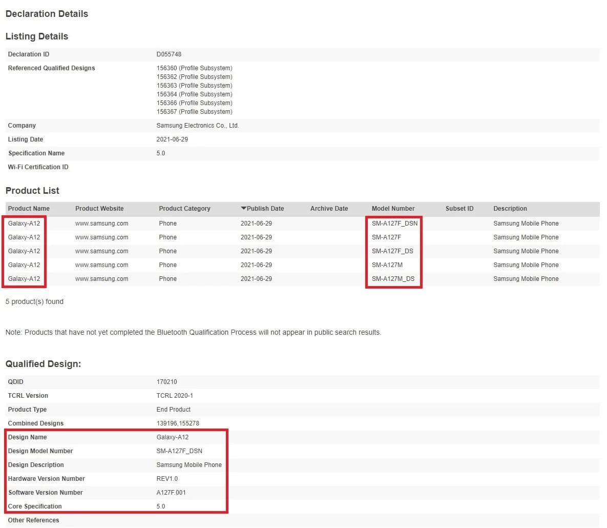 اطلاعات گوشی گلکسی A12s سامسونگ که هنوز معرفی نشده است در دو نسخه به شماره مدلهای SM-A127F و SM-A127M در پایگاه داده Bluetooth SIG رویت شده است. طبق مستندات ارائه شده در این پایگاه داده، هر دو مدل گوشی سامسونگ از فناوری بلوتوث ۵.۰ و خشاب دوگانه سیم کارت برخوردار هستند. همچنین صفحه پشتیبانی گلکسی A12s در وبسایت فیلیپین این شرکت ایجاد شده است.