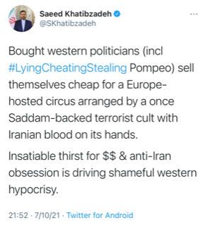 به گزارش سایت طلا،«سعید خطیبزاده»سخنگوی وزارت امور خارجه جمهوری اسلامی ایران امشب (شنبه) در توئیتی به حضور سیاستمداران غربی در نشست گروهک تروریستی منافقین اشاره کرد و نوشت: «سیاستمداران خودفروخته غربی (از جمله پامپئو مفتخر به دروغگویی، تقلب و سرقت) خود را ارزان فروخته و در سیرکی به میزبانی اروپا شرکت کردهاند که توسط یک فرقه تروریستی برگزار شده که زمانی مورد حمایت صدام بود و دستش به خون ایرانیها آغشته است.