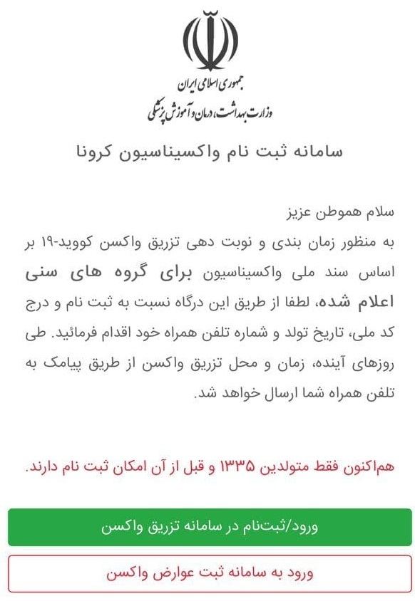 سامانه ثبتنام واکسن کرونا برای متولدین ۱۳۳۵ و ماقبل آن جهت ثبتنام تزریق واکسن کرونا بازگشایی شد.