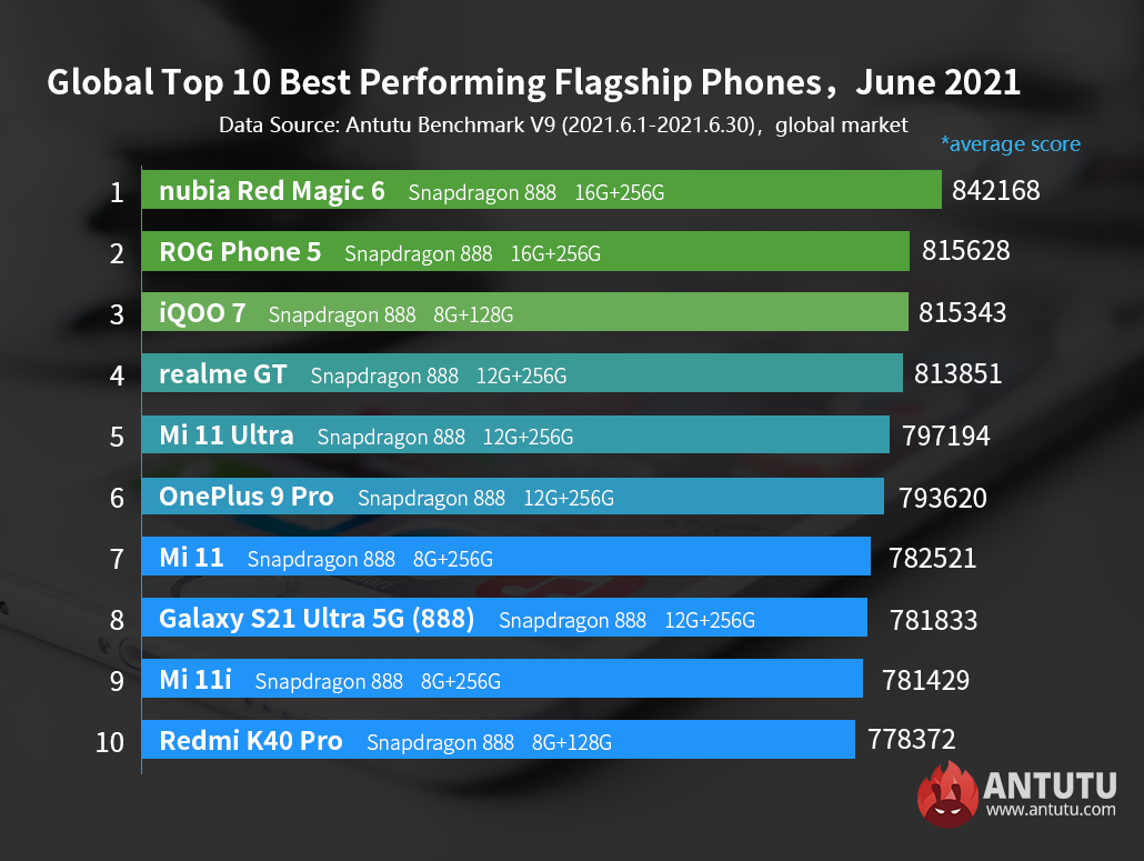 بنچمارک آنتوتو فهرست برترین گوشیهای پرچمدار اندرویدی در ماه ژوئن ۲۰۲۱ را منتشر کرد. در صدر این فهرست نام نوبیا رد مجیک ۶ دیده میشود و پس از آن موبایلهای برند ایسوس و iQOO حضور دارند.
