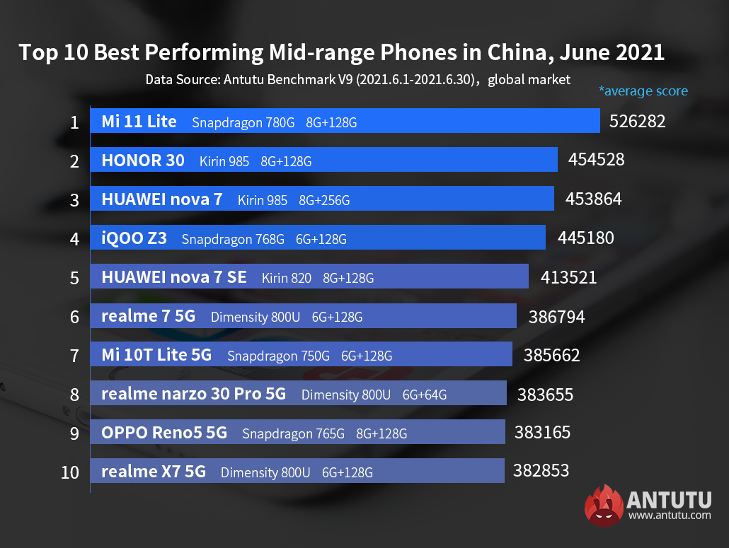 آنتوتو همچنین فهرست برترین گوشیهای میانرده ماه ژوئن در بازار چین را هم منتشر کرده که در صدر آن برای دومین ماه متوالی نام شیائومی می ۱۱ لایت با اسنپدراگون ۷۸۰G مشاهده میشود. این دستگاه با امتیاز ۵۲۶,۲۸۲ اختلاف زیادی با آنر ۳۰ دارد که در جایگاه دوم قرار گرفته و با کرین ۹۸۵ امتیاز ۴۵۴,۵۲۸ را کسب کرده است. رده سوم در دست هواوی نوا ۷ است که با چیپست کرین ۹۸۵ از بنچمارک آنتوتو امتیاز ۴۵۳,۸۶۴ را به دست آورده است.
