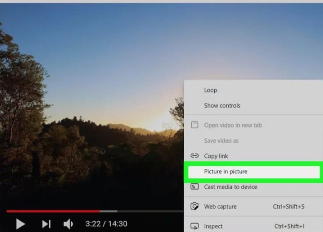 4-دوباره روی ویدیو کلیک راست کنید. با کلیک راست دوم منوی داخلی مرورگر شما ظاهر می شود که اکنون گزینه تصویر در تصویر را نمایش می دهد.