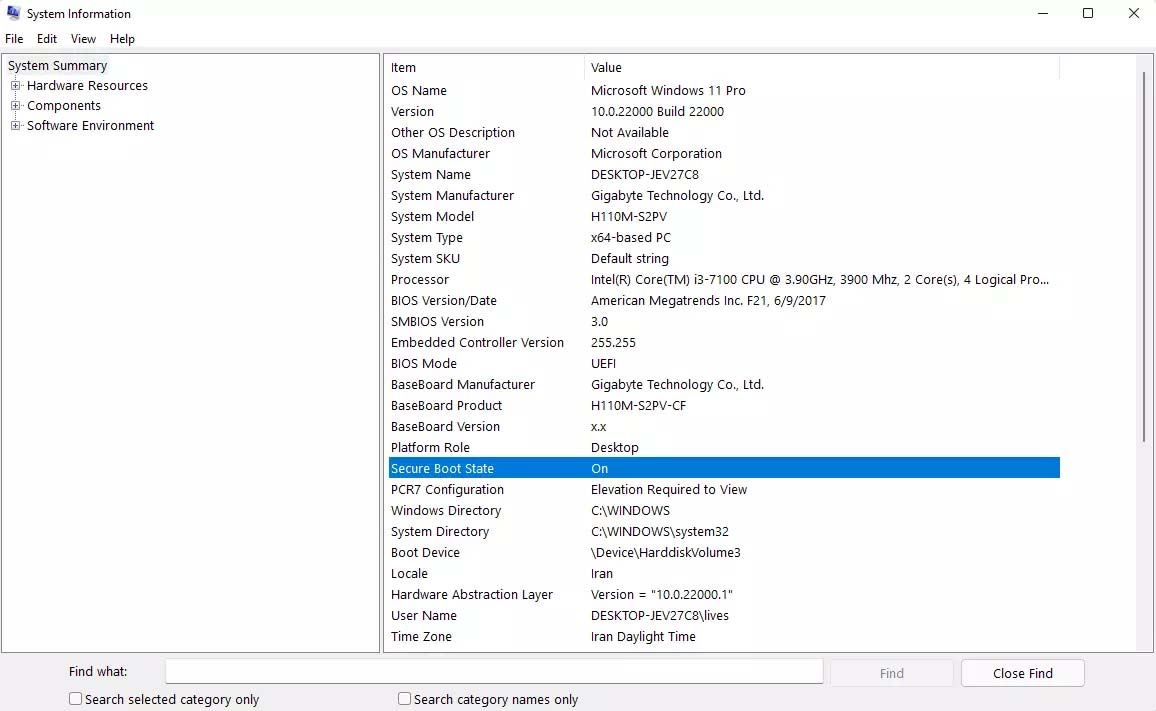 درادامه، پنجره System Information باز می‌شود. حالا از بخش Secure Boot State می‌توانید بررسی کنید که Secure Boot کامپیوترتان روشن است یا خیر. توجه کنید اگر در‌مقابل BIOS Mode عبارت Legacy نوشته شده باشد، در این حالت Secure Boot در کامپیوترتان پشتیبانی نمی‌شود. البته امکان دارد تنظیمات UEFI کامپیوتر شما فعال نباشد.