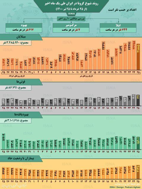طبق اعلام وزارت بهداشت، ویروس کرونا تا ظهر جمعه (۲۵ تیر ۱۴۰۰) سه میلیون و ۴۸۵ هزار و ۹۴۰ نفر را در ایران به طور قطعی مبتلا کرده و در مجموع تا این روز ۸۶ هزار و ۷۹۱ نفر را به کام مرگ کشانده است. از سوی دیگر، سه میلیون و ۱۰۱ هزار و ۶۱۸ نفر در ایران تاکنون بهبود یافته‌اند. بررسی آمارهای وزارت بهداشت نشان می‌دهد که طی ۱۰ روز اخیر (۱۶ تا ۲۵ تیر ۱۴۰۰) بطور متوسط هر ساعت ۷۴۴ نفر در ایران مبتلا و ۷ نفر قربانی کرونا شده‌اند و در هر ساعت حدود ۶۱۷ نفر نیز بهبود یافته‌اند. در این اینفوگرافیک روند شیوع کرونا در ایران طی یک ماه اخیر (از ۲۵ خرداد تا ۲۵ تیر) را مشاهده می‌کنید.