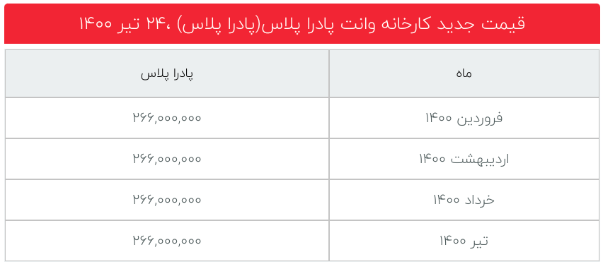 قیمت بازار این خودرو اعلام نشده اما جدول زیر قیمت کارخانهای خودروی پادرا پلاس است.
