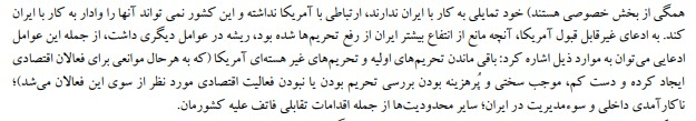 آمریکا عواملی را برای عدم تمایل بخش خصوصی خارجی برای همکاری با ایران مطرح می‌کرد که عبارتند از: «به ادعای غیر قابل قبول آمریکا، آنچه مانع از انتفاع بیشتر ایران از رفع تحریم‌ها شده بود، ریشه در عوامل دیگری داشت، از جمله این عوامل ادعایی می‌توان به موارد ذیل اشاره کرد: باقی ماندن تحریم‌های اولیه و تحریم‌های غیر هسته‌ای آمریکا (که به هر حال موانعی برای فعالان اقتصادی ایجاد کرده و دست کم، موجب سختی و پر هزینه بودن بررسی تحریم بودن یا نبودن فعالیت‌ اقتصادی مورد نظر از سوی این فعالان می‌شد)؛ ناکارآمدی داخلی و سوءمدیریت در ایران؛ سایر محدودیت‌ها از جمله اقدامات تقابلی فتف علیه کشورمان».