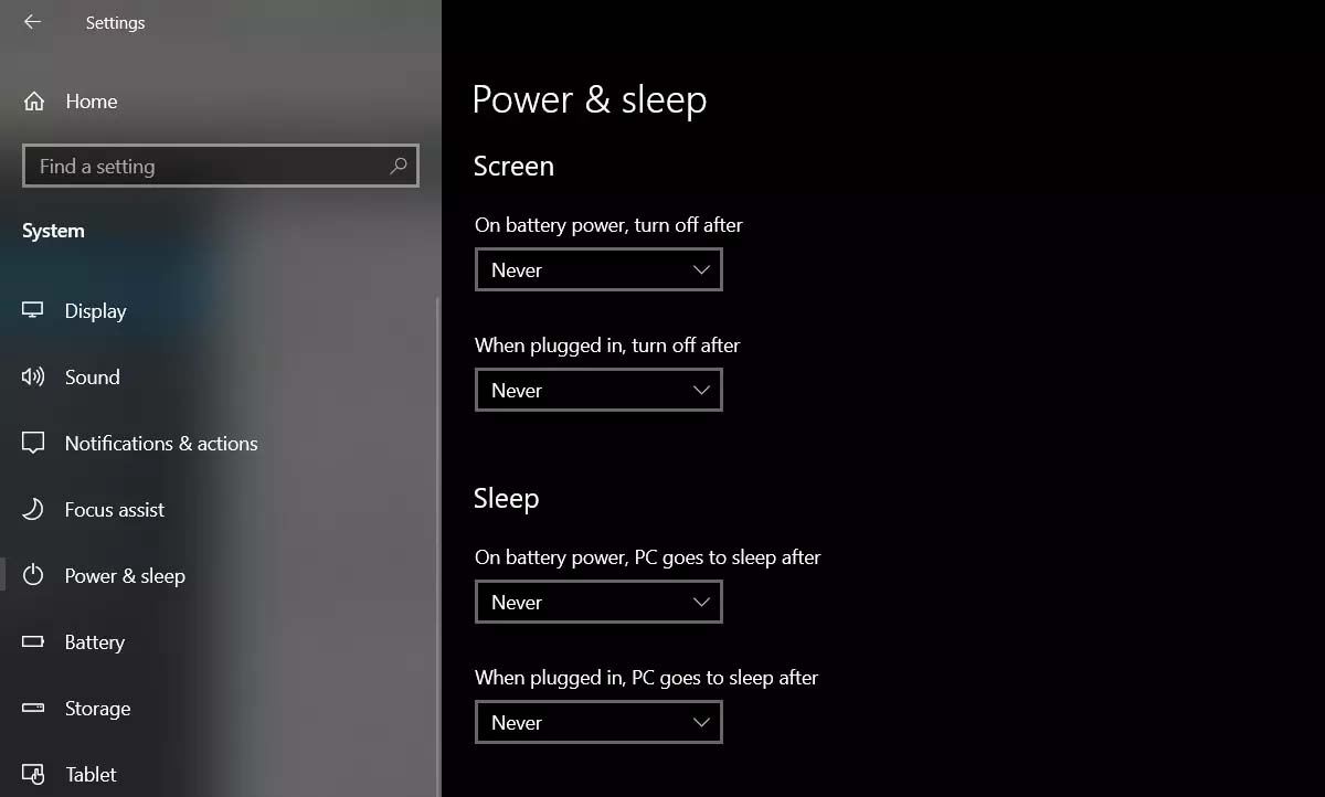 اگر از لپتاپ استفاده میکنید، از بخش «On battery power, turn off after»، گزینهی Never را انتخاب کنید. در بخش دوم روی «When plugged in, turned off after» کلیک و مانند مرحله قبل، Never را انتخاب کنید. در بخش Sleep دو گزینه وجود دارد که باید مانند مراحل قبل، گزینه Never را انتخاب کنید.