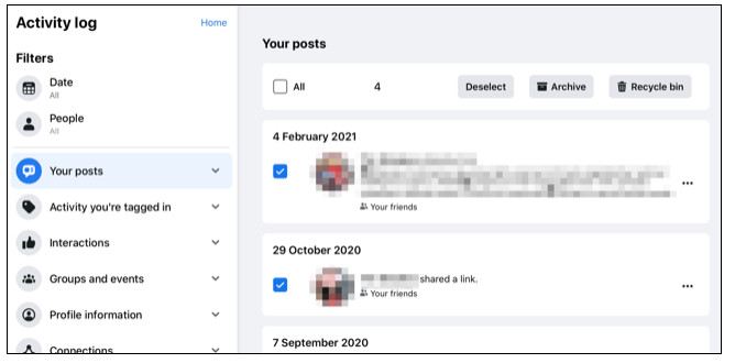 برای دسترسی به این مورد در نسخه وب فیسبوک، روی پیکان رو به پایین در گوشه بالا سمت راست هر صفحه کلیک کنید، سپس Settings & Privacy > Activity Log را انتخاب کنید. برای دیدن لیست پست ها، روی Your posts در منوی سمت چپ کلیک کنید. می توانید از کادرهای تأیید کنار پست ها برای انتخاب هر تعداد مورد علاقه خود استفاده کنید، سپس روی Archive کلیک کنید تا آنها به بایگانی ارسال شوند.