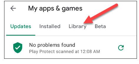 تب Library تمام برنامه ها و بازیهایی را که از Play Store بارگیری کرده اید و در حال حاضر در دستگاه شما نیستند نشان می دهد. می توانید لیست را بر اساس "اخیرا" یا "الفبایی" مرتب کنید.