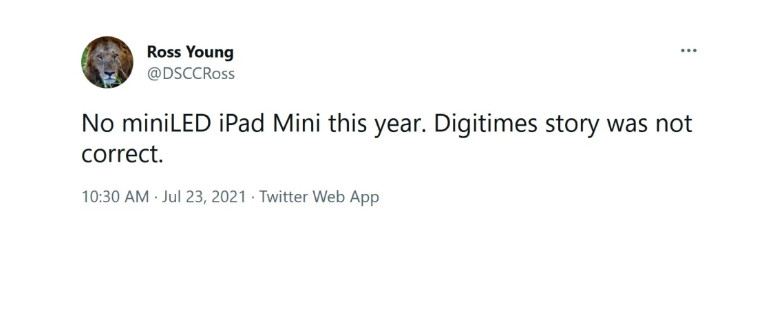 در این توییت، یانگ اشاره کرد که منبع شایعه اصلی، Digitimes است و iPad mini 6 امسال صفحه مینی LED ارائه نمی دهد. این بدان معنا نیست که نسل ششم آیپد مینی امسال عرضه نمی شود، فقط به این دلیل که تصاویر بهبودیافته در نمایشگر مینی ال ای دی را ارائه نمی دهد.