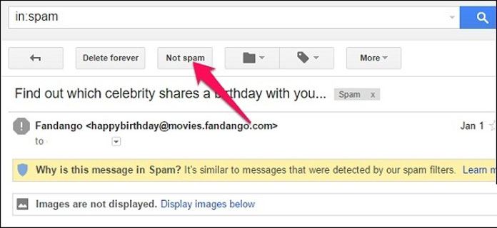 سپس بر روی دکمه Not Spam بالای صفحه کلیک کنید.