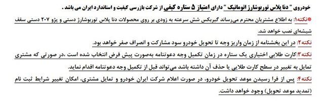 همچنین امکان صلح و نقل و انتقال خودرو حتی به صورت وکالتی مطابق با مصوبات کمیته خودرو وجود ندارد، ثبتنام برای مشتریان حقوقی میسر نخواهد بود، کد نمایندگی که در مرحله دوم و در زمان واریز وجه دوم توسط متقاضی انتخاب میشود، میبایست با آدرس و کد پستی متقاضی در یک استان باشد و گارانتی خودرو نیز پس از پنج ماه از زمان تحویل خودرو در صورت عدم مراجعه به نمایندگی برای دریافت سرویس اولیه باطل میشود. ضمن اینکه در مراجعه به نمایندگی کارکرد حداقل ۱۰۰۰ کیلومتری خودرو نیز الزامی است.