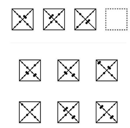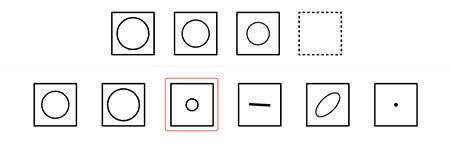 • توضیح برای جواب سوال تست هوش کتل: در قسمت صورت سوال، ۳ مربع وجود دارد که هر کدام تصویر یک دایره را به همراه دارند. میبینید که تصویر دایره به تدریج کوچکتر میشود. شما باید از میان شش گزینه، تصویری را پیدا کنید که در مربع نقطه چین قرار بگیرد. در این جا باید تصویری که با کادر قرمز رنگ مشخص شده است را انتخاب کنید، زیرا این تصویر دارای دایرهای است که از آخرین دایره سوال کوچکتر است.