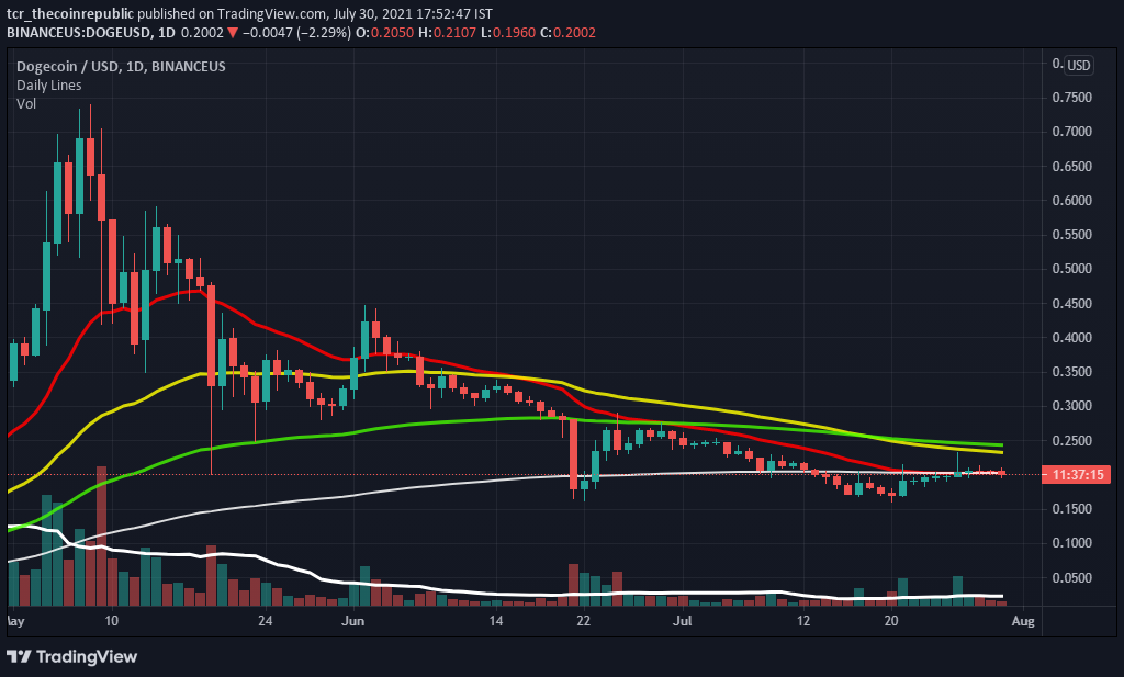 در نزدیکی میانگین متحرک حیاتی 20 و 200روزه به صورت مسطح و بدون نشانهای از حرکت قابل توجه در حال معامله است. حجم معاملات در نمودار ماهانه بالا نیست و پایینتر از خط میانگین قرار گرفته که باید در جلسات معاملاتی آتی بهبود یابد. بنابراین، این رمزارز به یک عامل محرک برای بهبود روند خود نیاز دارد. با در نظر گرفتن اینکه دوجکوین بالای DMA 50 و 100 حفظ شود، کشش مثبت حجم معاملات، خریداران بیشتری را به بازار میکشاند.