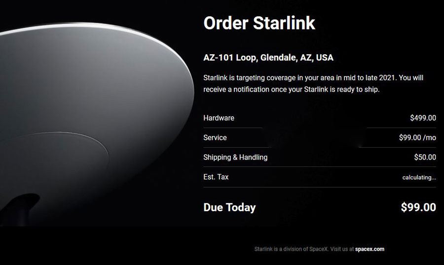 طبق بررسی های انجام شده هزینه استفاده از سرویس اینترنت ماهواره ای استارلینک یا Starlink ماهانه 99 دلار آمریکا است که در تصویر فوق که مربوط به صورت حساب رسمی وب سایت Starlink.com است قابل مشاهده است.
