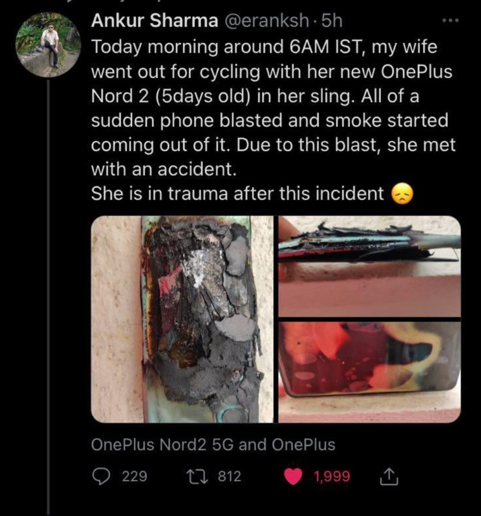 «انکور شارما»، همسر این خانم در توییتر که با انتشار تصاویری موضوع را رسانهای کرده بود، میگوید همسرش ۵ روز قبل این موبایل جدید را خریداری کرده و حین دوچرخه سواری و بدون دلیل خاصی، ناگهان موبایلش منفجر میشود. شارما تاکید میکند که انفجار موبایل باعث شده همسرش در حین دوچرخه سواری تمرکز خود را از دست دهد و تصادف کند. شارما میگوید به دلیل تصادف، همسرش دچار آسیب دیدگی نیز شده است.