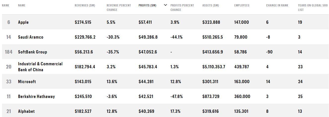 پس از اپل، غول نفتی عربستانی یعنی آرامکو به چشم میخورد. آرامکو با سود ۴۹.۲۸۷ میلیارد دلاری، حالا دومین کمپانی سودآور در جهان است. در رتبه سوم سافتبانک با سود ۴۷.۰۵۳ میلیارد دلار قرار گرفته و در مقام چهارم بانک صنعتی و بازرگانی چین با سود ۴۵.۷۸۳ میلیارد دلار قرار دارد. در رتبه پنجم هم مایکروسافت با سود ۴۴.۲۸۱ میلیارد دلاری به چشم میخورد.