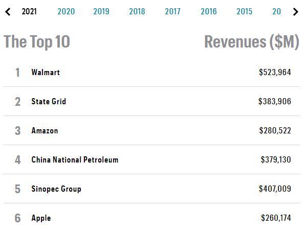 اپل در زمینه درآمد رشد چشمگیری در لیست فورچون جهانی ۵۰۰ داشته. این کمپانی از جایگاه دوازدهم در لیست قبلی، به رتبه ششم صعود کرده است. از نظر درآمد به ترتیب شرکتهای والمارت، State Grid، آمازون، شرکت ملی نفت چین و Sinopec Group در رتبههای اول تا پنجم به چشم میخورند.