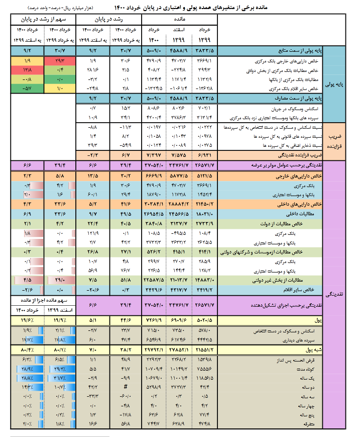 براساس آن حجم نقدینگی در پایان خردادماه ۱۴۰۰ به رقم سه هزار و ۷۰۵ هزار و ۴۰۰ میلیارد تومان رسید که در مقایسه با پایان سال گذشته (اسفند ۹۹) معادل ۶.۶ درصد رشد داشته است. میزان رشد نقدینگی در خرداد ۹۹ برابر ۷.۵ درصد بود.