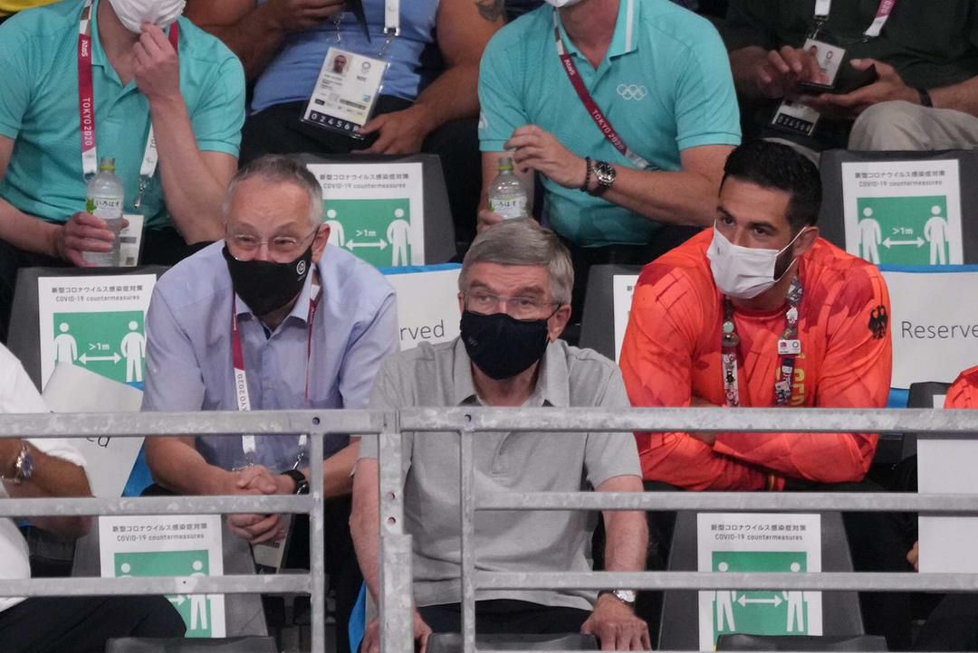 * توماس باخ رئیس کمیته بین المللی المپیک و نناد لالوویچ رئیس اتحادیه جهانی کشتی در سالن حضور دارند.