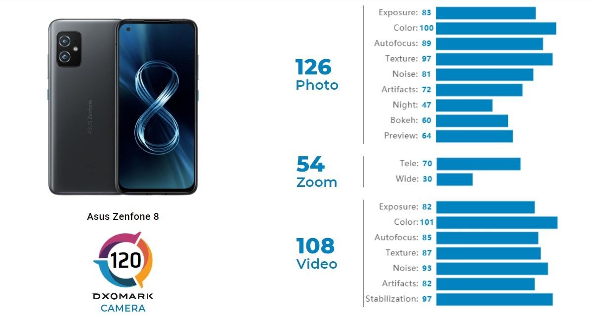 این گوشی هوشمند ایسوس که چند ماه پیش معرفی شد، در بررسی DxOMark به امتیاز ۱۲۰ دست پیدا کرده که با پیکسل ۵ یکسان و یک امتیاز از گلکسی S21 بیشتر است. پرچمدار سامسونگ از این منبع امتیاز ۱۱۹ را دریافت کرده. آیفون ۱۲ مینی هم موفق به کسب امتیاز ۱۲۲ شده است.
