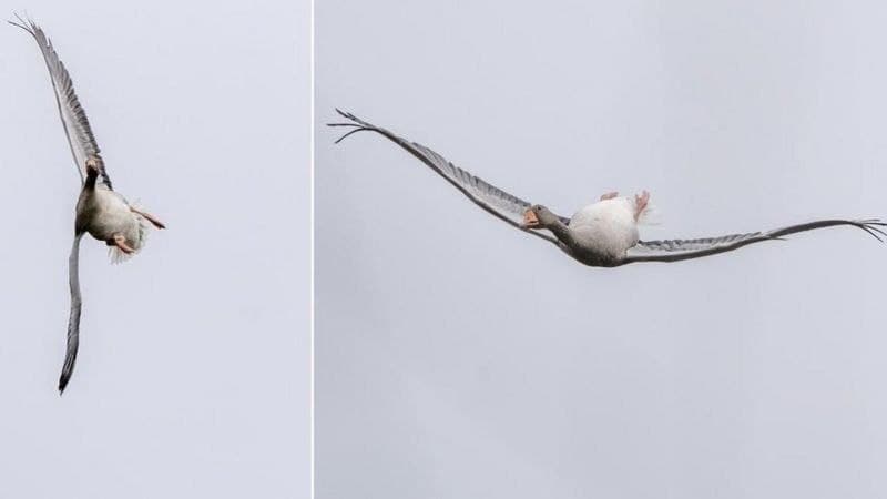 یک عکاس هلندی به تازگی عکسی را منتشر کرده است که آن یک غاز به حالت وارونه در آسمان درحال پرواز است.