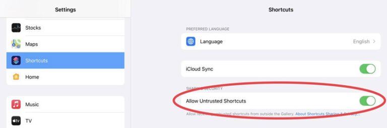البته قبل از انجام این کار باید در آیفون یا آیپد خود به قسمت Settings بروید و بعد از انتخاب Shortcuts گزینهی قرار گرفته در جلوی عبارت Allow Untrusted Shortcuts را روشن کنید.
