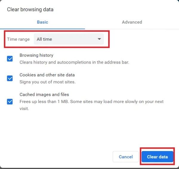 3-در پنجره باز شده، تیک تمام گزینه‌ها را بزنید و در بخش Time range گزینه All time را انتخاب کنید. سپس بر روی clear data کلیک کنید.
