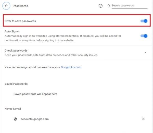 2-اطمینان حاصل کنید که گزینه Offer to Save Passwords روشن است.