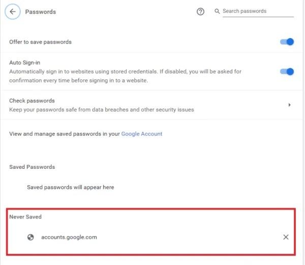 شما باید لیستی از پسورد‌های ذخیره شده را در بخش Auto Sign-in ببینید و سایت‌هایی که اخیرا پسورد ورودشان ذخیره شده است، در ابتدای لیست قرار دارند. در بخش Never Saved هم وبسایت‌هایی هستند که شما برای گوگل کروم تعیین کرده‌اید تا پسوردتان را ذخیره نکند و در هنگام ورود به سایت، پیشنهادی در راستای ذخیره پسورد ارائه ندهد. بنابراین، در این بخش به دنبال سایتی که در آن به مشکل ذخیره نشدن پسورد برخورده‌اید، بگردید.