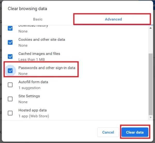4-مطابق با فرایند توضیح داده شده در بخش قبل، پنجره Clear browsing data را باز کنید و این بار وارد زبانه Advanced شوید و سپس گزینه Passwords and other sign-in data را فعال کنید. در نهایت دکمه Clear data را بزنید.