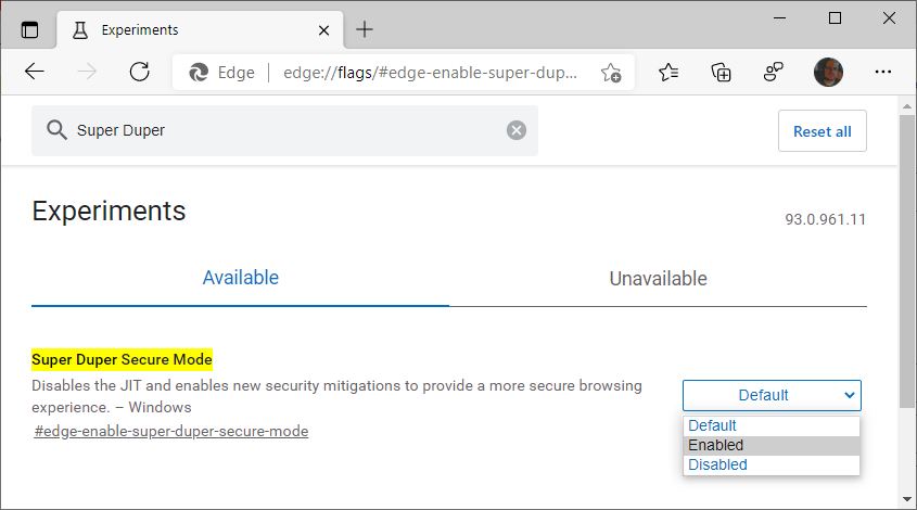 حالت Super Duper Secure قابلیتی را در موتور جاوا اسکریپت مرورگر اج غیرفعال میکند که کارکرد آن افزایش سرعت اجرای کد سایتهاست. این فناوری کامپایل Just-In-Time نام دارد و اگرچه باعث بهبود عملکرد نرمافزار میشود اما کارکرد آن فوقالعاده پیچیده است و به همین خاطر بروز باگ در آن به سادگی اتفاق میافتد. مایکروسافت قبلا با اشاره به تحقیقی از موزیلا گفته بود که بیش از نیمی از اکسپلویتهای کروم از سال ۲۰۱۸ مربوط به JIT بوده است.