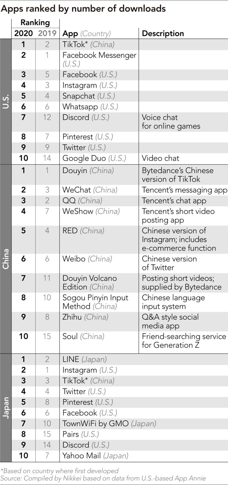 به گفته Nikkei، در سطح جهانی پس از تیک تاک به ترتیب نام فیسبوک، واتس‌اپ، اینستاگرام، فیسبوک مسنجر، اسنپ‌چت، تلگرام، Likee، پینترست و توییتر دیده می‌شود. در ادامه می‌توانید رده‌بندی پردانلودترین اپلیکیشن‌ها در بازار آمریکا، چین و ژاپن را هم به تفکیک مشاهده کنید.