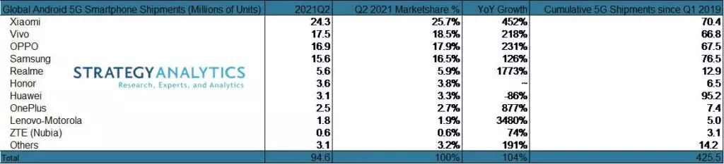 طبق گزارش فوق، در این دوره سهماهه، در مجموع ۹۵ میلیون دستگاه گوشی اندرویدی 5G در جهان به فروش رسیده و شیائومی با ۲۴ میلیون دستگاه، رتبه اول را از این حیث در اختیار گرفته است. در ۹ سهماهه گذشته، شیائومی ۷۰ میلیون دستگاه گوشی هوشمند 5G فروخته تا در رده دوم و پشت سر سامسونگ قرار بگیرد که در همین مدت، ۷۷ میلیون دستگاه فروخته است.